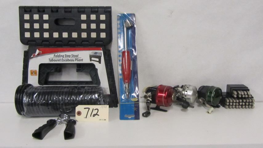 3 CLOSED FACE FISHING REELS, PLASTIC FOLDING STEP STOOL, HAND EXERSICER, AIR CHUCK FOR INFLATING TIRES, AIR LINE, SET OF METAL MARKING PUNCHES 27 LETTERS LIKE NEW, SET OF 10 NUMBER METAL MARKING PUNCHES