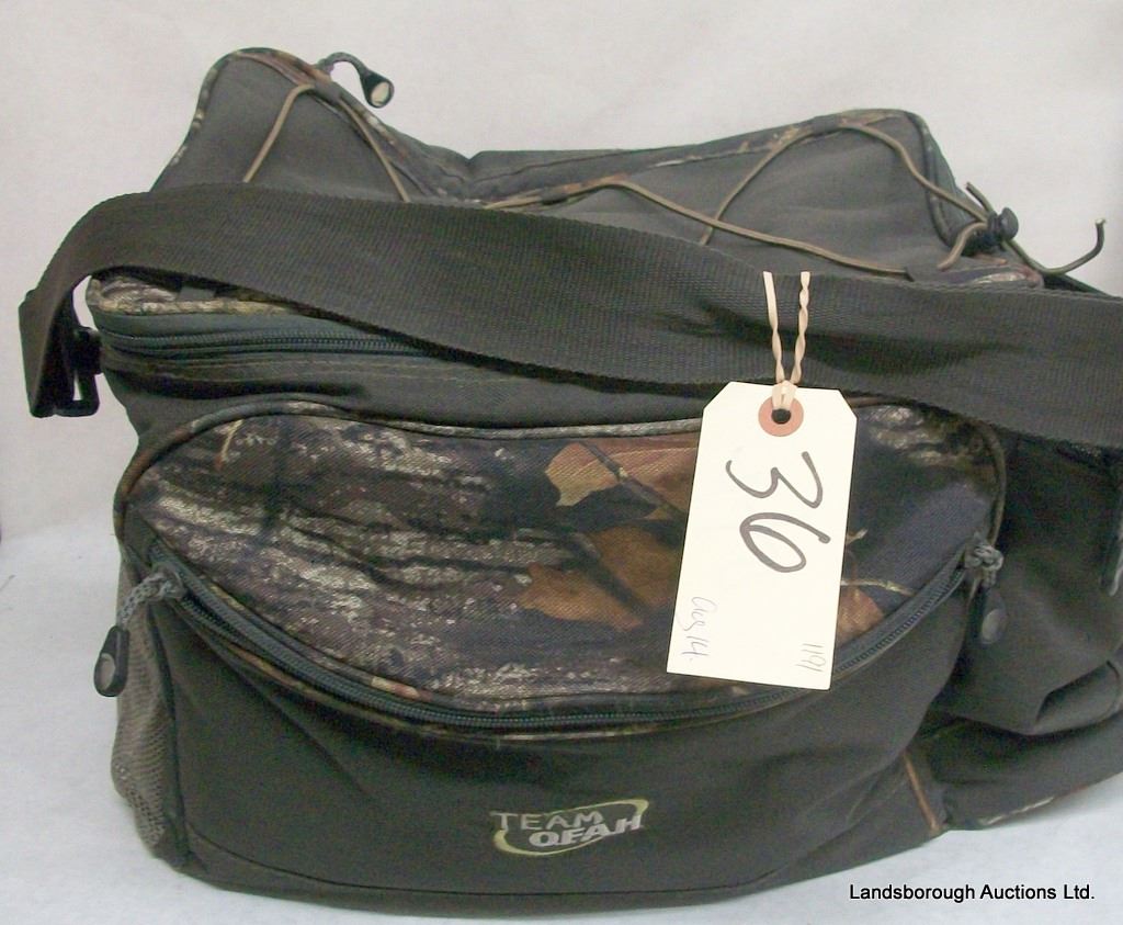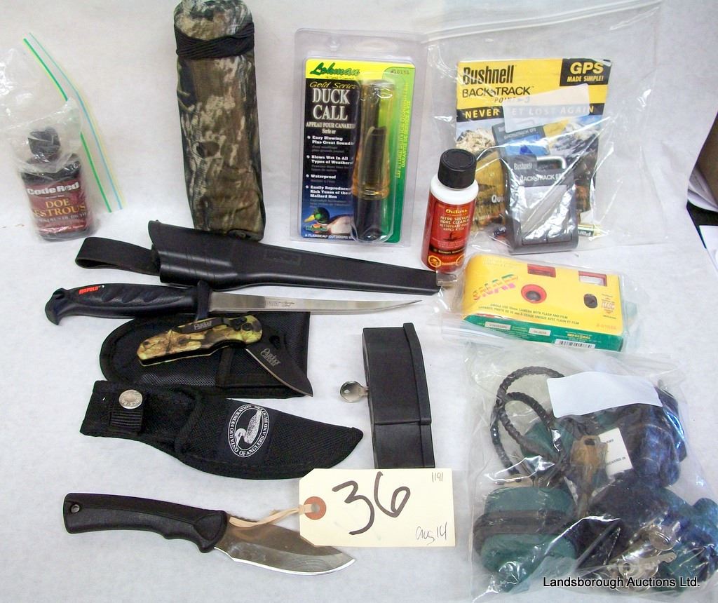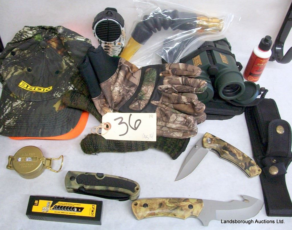 TWO PAIRS OF GLOVES, TWO PACKAGES OF FIELD DRESSING GLOVES, TWO HATS, ONE BURRIS 10X32 BINOCULARS, ONE RATTLER, ONE ELECTRONIC DEER CALL, ONE QUAKERBOY BRAWLER, ONE UNOPENED LOHMAN DUCK CALL, ONE COMPASS, ONE BUSHNELL BACKTRACK POINT 3 WITH MANUAL, ONE 2OZ BOTTLE OF DOE ESTROUS, ONE EACH BOTTLE OF OUTERS GUN OIL AND NITRO SOLVENT (BOTH ABOUT 3/4 FULL), 6 VARIOUS HUNTING KNIVES, 7 TRIGGER LOCKS, 26 18MM OLFA BLADES, ONE DISPOSABLE CAMERA, ALL IN ONE COOLER BAG