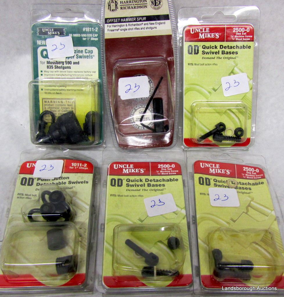 BOX LOT OF ASSORTED HARDWARE. THREE PACKS OF SWIVEL STUDS, FOR WOOD OR SYNTHETIC STOCKS.ONE HAMMER EXTENDER FOR H AND R RIFLES, ONE MAGAZINE CAP WITH SWIVELS FOR MOSSBERG 590 & 835, AND ONE SET OF PUSH BUTTON SWIVELS FOR BOLT ACTION RIFLES.