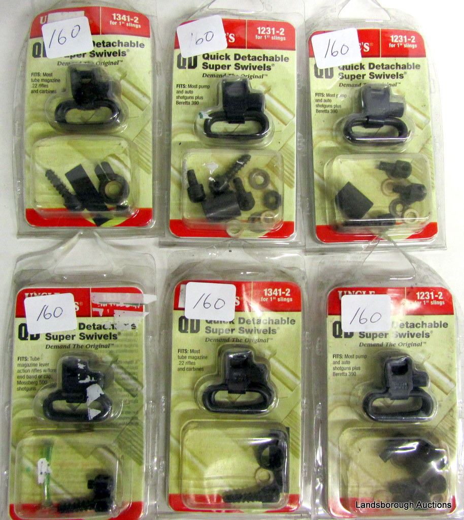 BOX LOT OF SIX SETS OF UNCLE MIKE'S QD SWIVELS AND BASES. FOR TUBE FED .22 RIFLES, PUMP AND AUTO SHOTGUNS, BERETTA 390, AND MOSSBERG 500.