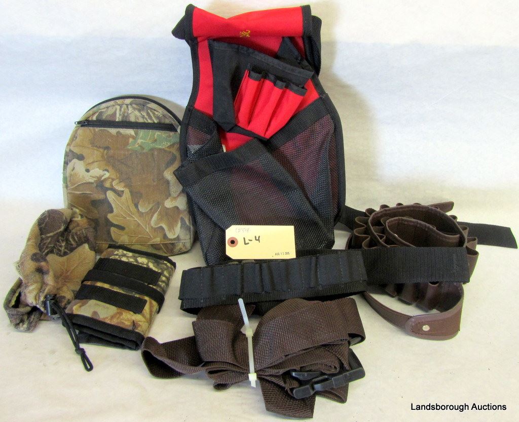 1 LEATHER SHELL BELT, ONE BLACK NYLON SHELL BELT, CAMO BINOCULAR CASE, CAMO CARTRIDGE CASE, BROWNING HULL BAG/BELT, BOW VEST HARNESS