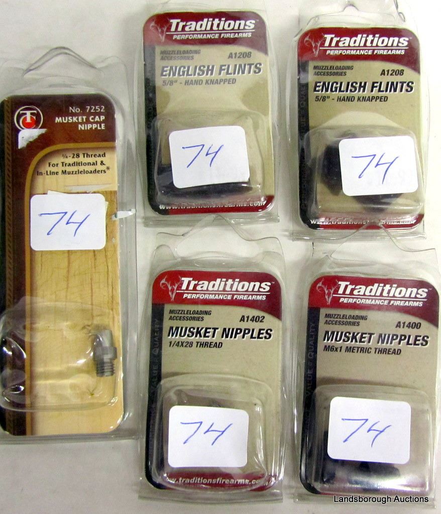 5/8" HAND KNAPPED ENGLISH FLINT. WITH A1400, A1402, AND #7252 MUSKET NIPPLES.
