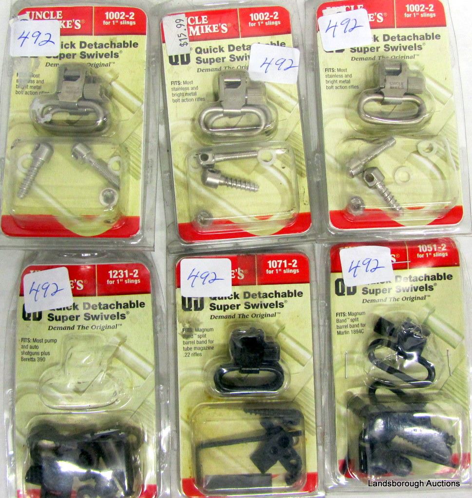 BOX LOT OF SIX SETS OF UNCLE MIKES QD SWIVELS. THREE FOR MOST BOLT ACTION RIFLES, ONE FOR MOST AUTO AND PUMP SHOTGUNS, MARLIN 1894C, SPLIT BARREL BAND FOR 22 MAGAZINE.