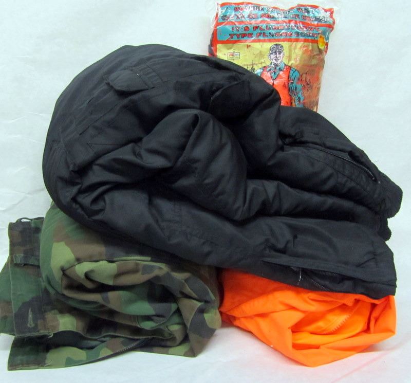 CAMOFLAGE PANTS, SIZE 40 WAIST. BLACK INSULATED SNOW PANTS, 40X42. ORANGE SAFETY VEST. ORANGE WINDBREAKER JACKET, SIZE XL.
