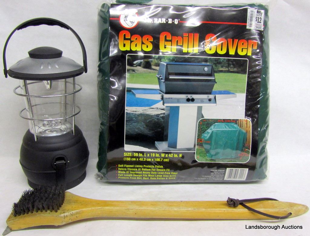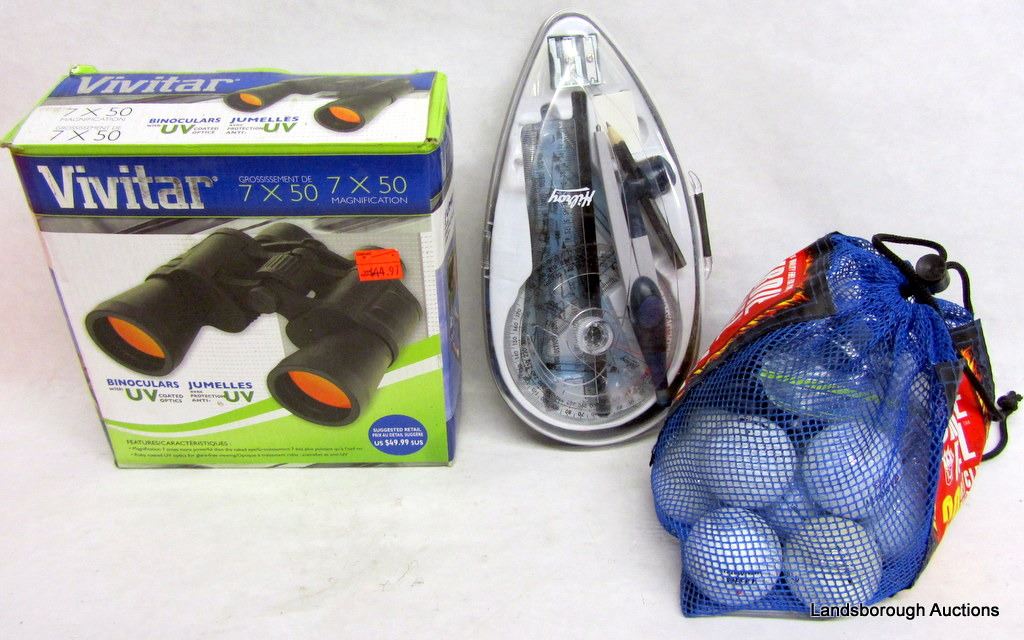 1 GAS GRILL COVER, 1 GRILL CLEANING BRUSH, 1 TORCH LANTERN, 1 THERMO SPORT SEAT, 1 PAIR CAMO GLOVES, 2 PACKS OF HOT PADS, 1 PROTRACTOR SET, 1 BAG OF GOLF TEES, 14 GOLF BALLS, 1 PAIR OF VIVITAR BINOCULARS 7X50