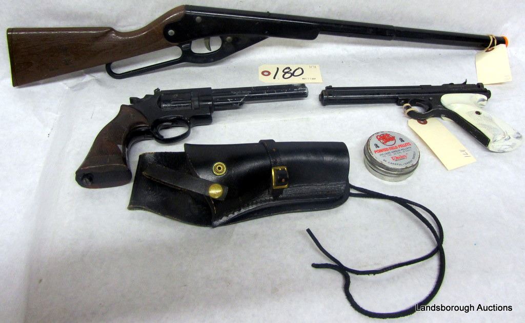 ONE CROSMAN M.115 IN .177, ONE CROSMAN M.38T IN .22 WITH HOLSTER, ONE DAISY TOY GUN, AND ONE TIN OF .22 POINTED FIELD PELLETS
