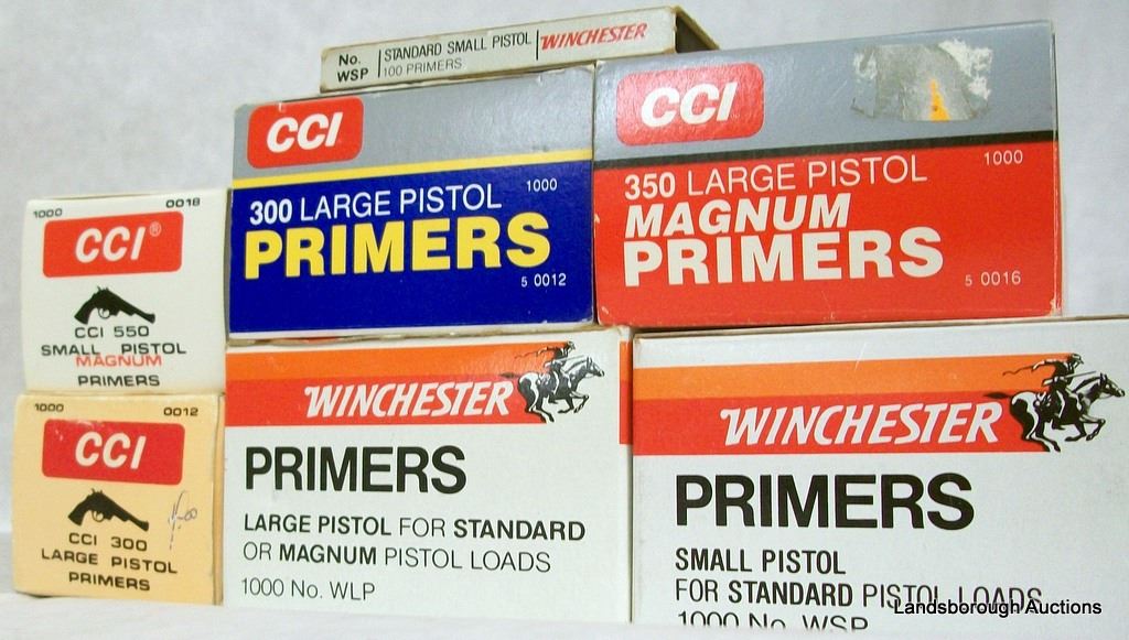 700 CCI 550 SMALL PISTOL MAGNUM PRIMERS, 1096 WINCHESTER SMALL PISTOL FOR STANDARD PISTOL LOADS PRIMERS, 800 CCI 350 LARGE PISTOL MAGNUM PRIMERS, 1000 CCI 300 LARGE PISTOL PRIMERS, 1000 WINCHESTER LARGE PISTOL FOR STANDARD/MAGNUM PISTOL LOADS PRIMERS, 1000 CCI 300 LARGE PISTOL PRIMERS, 100 CCI 550