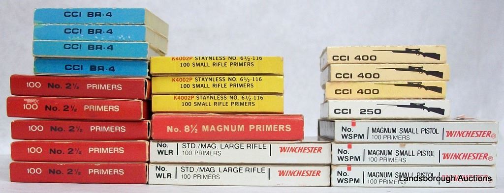 298 WINCHESTER STAYNLESS NO 6 1/2-116 SMALL RIFLE PRIMERS, 80 CIL AMORCES NO 8 1/2 MAGNNUM LARGE RIFLE PRIMERS, 500 REMINGTON NO 2 1/2 KLEANBORE CENTRE FIRE PRIMERS, 240 CCI 400 SMALL RIFLE PRIMERS, 286 WINCHESTER SMALL PISTOL FOR MAGNUM PISTOL LOADS PRIMERS, 190 WINCHESTER LARGE RIFLE FOR STANDARD/MAGNUM RIFLE LOAD PRIMERS, 100 CCI 250 LARGE RIFLE MAGNUM PRIMERS, AND 400 CCI BR4 SMALL RIFLE BENCHREST PRIMERS