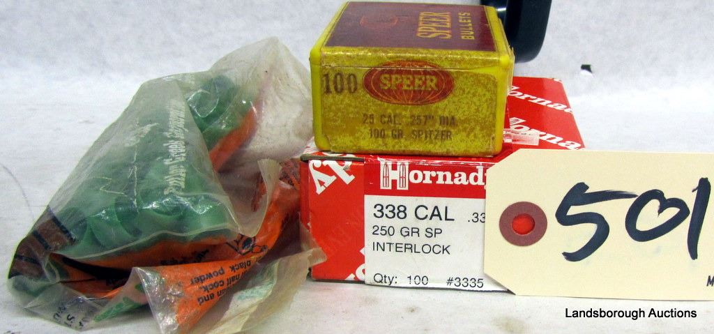 100 SPEER 25 CAL .257 DIA 100GR SPITZER, 100 HORNADY 338 CAL .338 250GR SP INTERLOCK, AND 100 COUNT BAG BUTLER CREEK POLY-PATCH