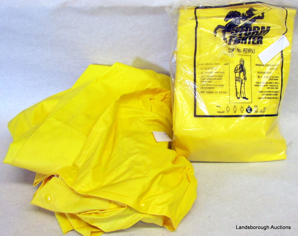 2 XL AND 1 MEDIUM YELLOW RAINCOATS, NEW. 2 CHILDRENS BOWS WITH ARROWS, 1 QUIVER.