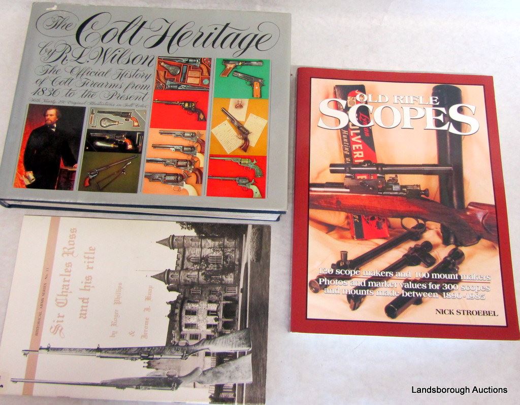 AMERICAN BOYS RIFLES, OLOD SCOPES, COLT HERITAGE, PARKER GUNS,GUNMARKS,ROSS RIFLE STORY, HISTORY AND DEVELOPMENT OF SMALL ARMS AMMUNITION VOLUME TWO.