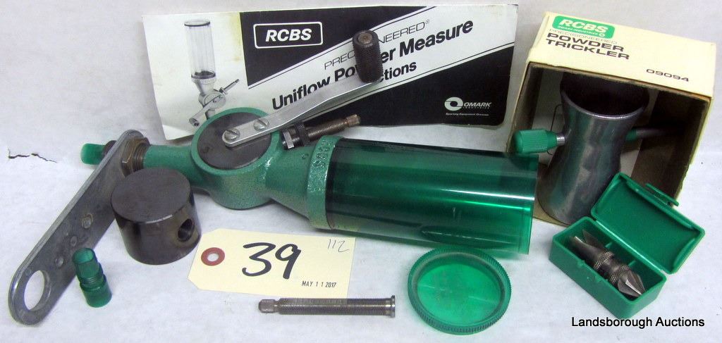 ONE RCBS UNIFLOW POWDER MEASURE, ONE RCBS POWDER TRICKLER (BOTH WITH INSTRUCTIONS) , AND ONE RCBS 17-45 BURRING TOOL