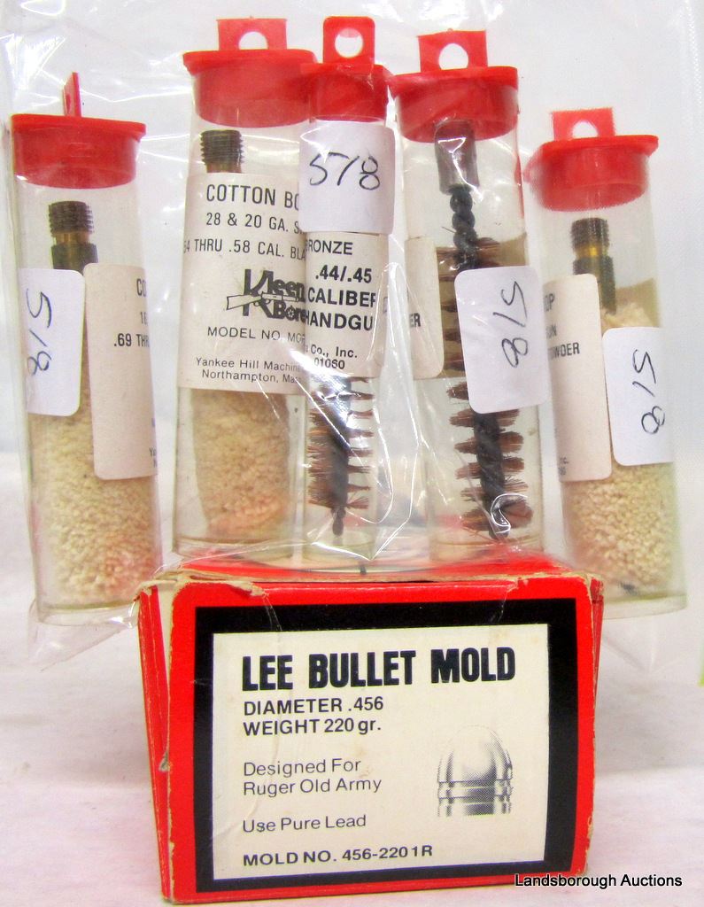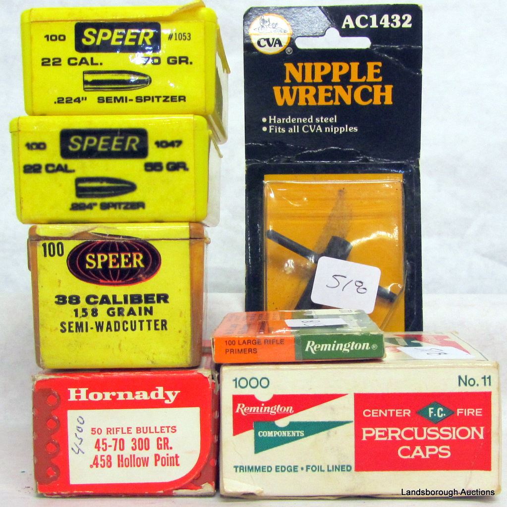 HORNADY 45-70 300 GRN; SPEER 38 CAL 158 GRN; SPEER 22 CAL 55 GRN AND 70 GRN; LEE BULLET MOLD 456-2201R; 800 NO 11 PERCUSSION CAPS; REMINGTON NO 9 1/2 LARGE RIFLE PRIMER; NIPPLE WRENCH; KLEEN BORE MOPS AND BRUSHES; VARIETY OF PAPER WADS.