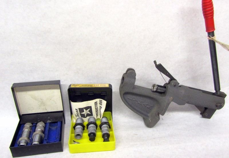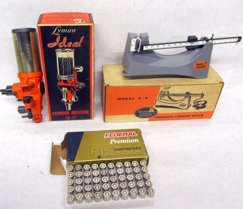 50 ROUND FACTORY BOX OF 45 ACP FEDERAL HYDRA-SHOK HOLLOWPOINTS. LYMAN SPARTAN RELOADING PRESS, TEXAN 44 MAGNUM 3 DIE SET, LYMAN 270 WIN 2 DIE SET, LYMAN IDEAL POWERDER MEASURE NO. 55, LYMAN MODEL D-5 SCALE.