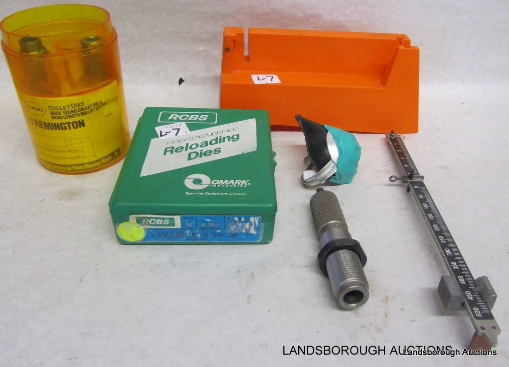 RCBS 25/06 REM SEATER DIE, RCBS 3-DIE .38 SPECIAL DIE SET, LEE 2-DIE .17 REMINGTON SET, AND LYMAN POWDER SCALE