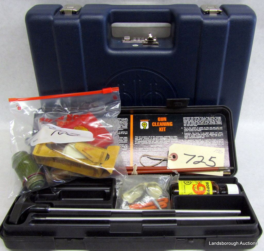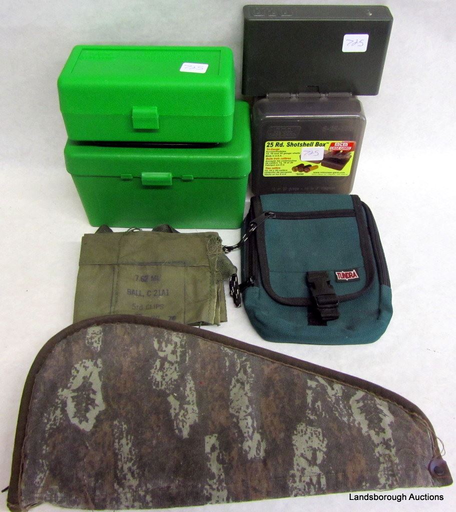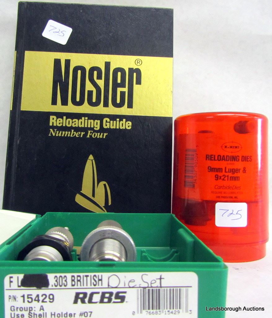NOSLER RELOADING GUIDE; LEE DIE SET 9MM LUGER; RCBS DIE SET 303 BRITISH; HOPPES CLEANING KIT AND A VINTAGE CLEANING KIT; FOUR AMMO BOXES; LOCKABLE BERETTA PISTOL BOX; SOFT PISTOL CASE.