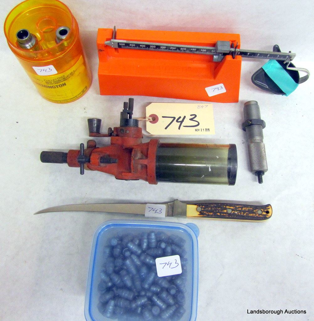 LYMAN POWDER MEASURE, LEE DIE SET 17 REMINGOTN, LYMAN SCALE, RCBS 30-06 SPRG SEATING DIE, SCRADE FILLETING KNIFE, 2 BOXES MAGAZINES, S& W 19-3 BOX, CONTAINER OF 158 GRN SWC.