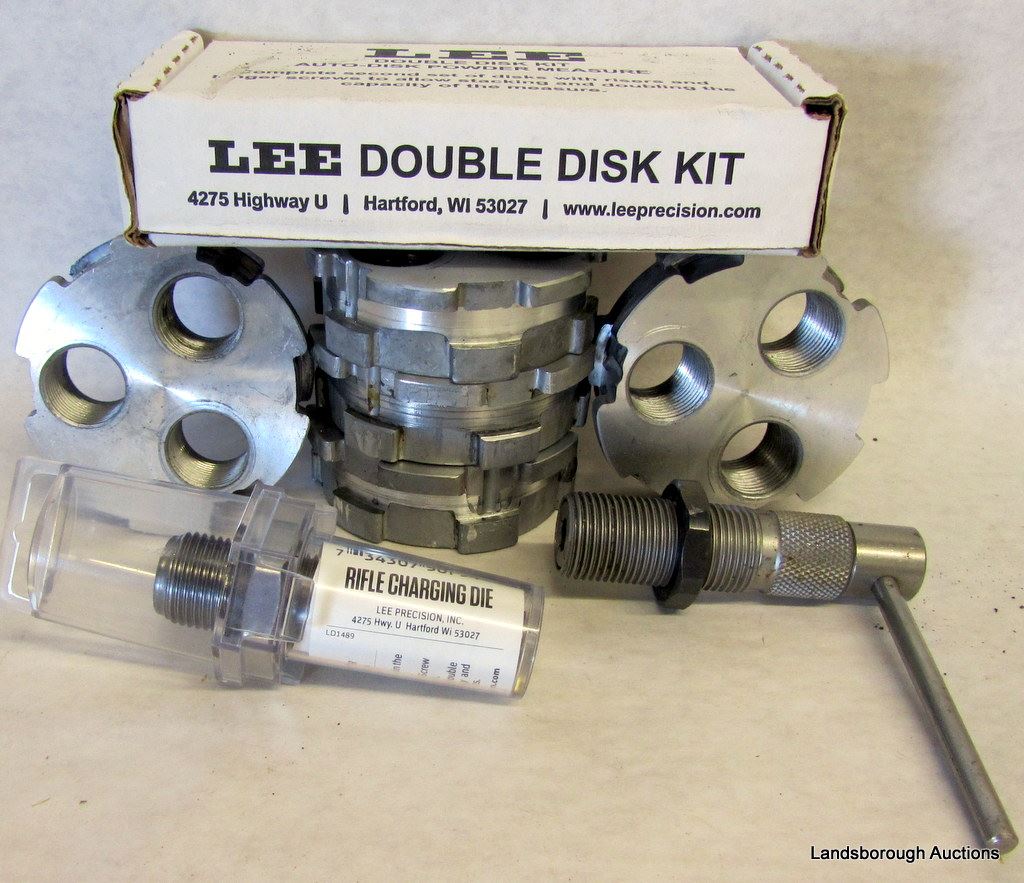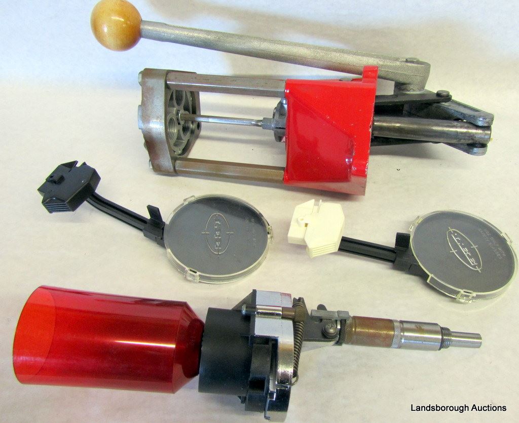 LEE TURRET PRESS WITH UPDATE KIT, 4 LOADING BLOCKS, RIFLE CHARGING DIE, DOUBLE DISK KIT, 5 EXTRA TURRETS + PARTS, RCBS BULLET PULLER WITH .35 COLLET