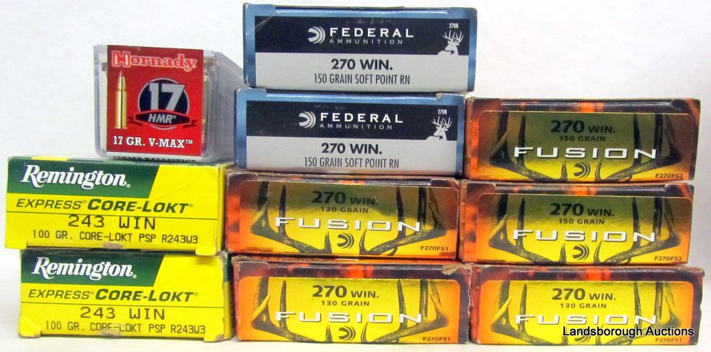 58 RNDS FEDERAL FUSION .270 WIN, 42 EMPTY BRASS FEDERAL FUSION .270 WIN, 40 RNDS FEDERAL .270 WIN, 50 RNDS V-MAX .17 HMR, 40 EMPTY BRASS REMINGTON EXPRESS .243 WIN