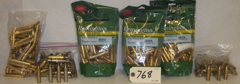 3 BAGS 50 PER BAG OF NEW REM. SPRINGFIELD 30 - 06 UNPRIMED BRASS, 1 BAG OF USED 30 - 06 BRASS, 1 BAG OF USED 308 BRASS, 1 BAG OF NEW UNPRIMED 35 WHELAN BRASS