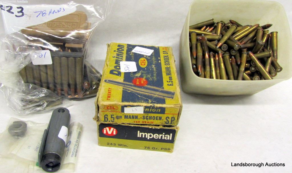 17 RNDS DOMINION 6.5 MS, 6 RNDS IMPERIAL 243 WIN, 224 RNDS 22 HORNET RELOADS, 78 RNDS 223 REM MILITARY, 8 RNDS 7.65MM, #10 SHELL HOLDER, DEPRIMING TOOL.