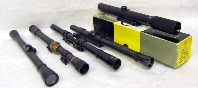 5 SCOPES. 2 WEAVER, 1 TASCO, 1 BUSHNELL, AND 1 UNKNOWN. BUSHNELL IS NEW IN BOX.