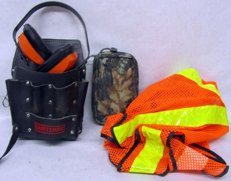 CRAFTSMAN LEATHER TOOL POUCH, BLACKHAWK CAMOFLAGE POUCH, REFLECTIVE SAFETY VEST, ORANGE EARMUFFS