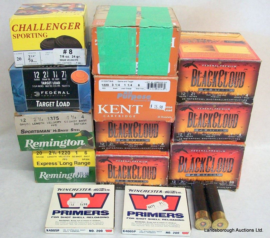 WILL BE VERY COSTLY TO SHIP193 RNDS VARIOUS 12GA 2 3/4", 27 RNDS FEDERAL BLACK CLOUD 12GA 3 1/2" BBSHOT, 43 RNDS VARIOUS 20GA 2 3/4", 110 PCS WINCHESTER WESTERN SHOT SHELL PRIMERS (NO.209) ALL IN CARRYING CASE.