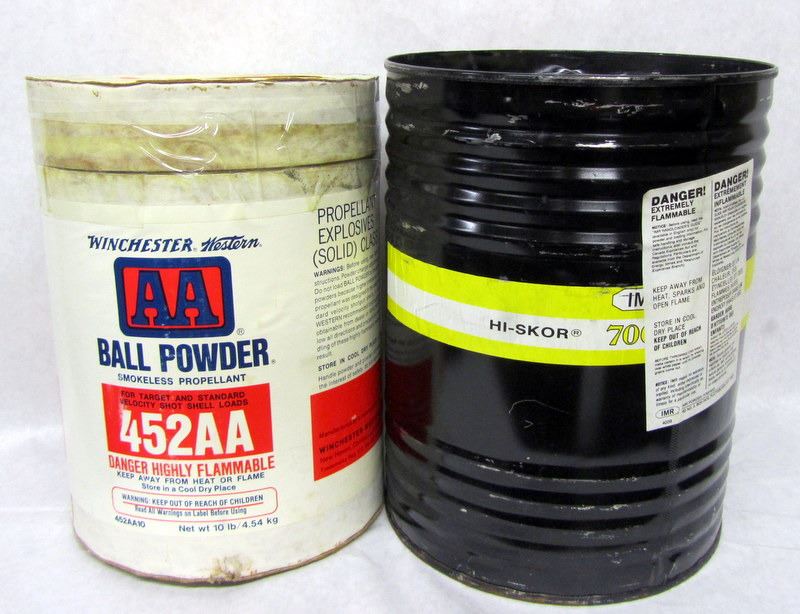 TWO PARTIAL CANS OF GUNPOWDER FOR RELOADING SHOTSHELLS. IMR 700-X (ROUGHLY 40% FULL), AND WINCHESTER 452AA (ROUGHLY 80% FULL).
