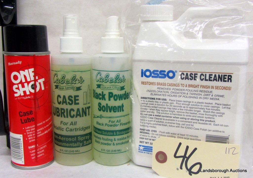 ONE 32OZ BOTTLE IOSSO CASE CLEANER, ONE HORNADY ONE SHOT CASE LUBE, ONE 7OZ CABELAS BLACK POWDER SOLVENT, AND 8OZ CABELAS CASE LUBRICANT