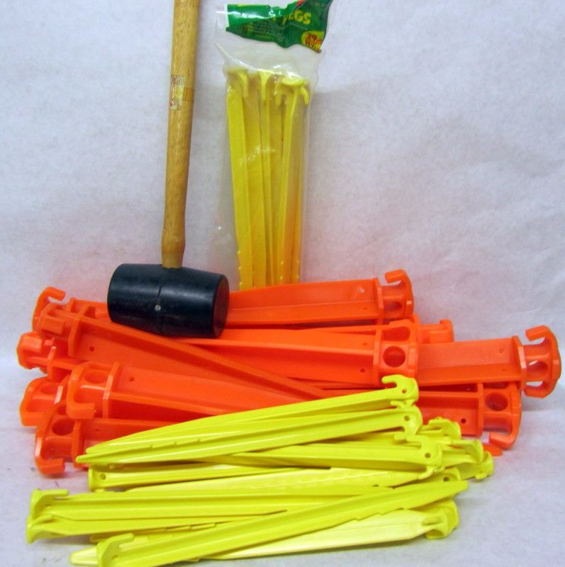 TOOLBOX FULL OF NEW TENT PEGS. VARIOUS SIZES. ALSO INCLUDES RUBBER MALLET
