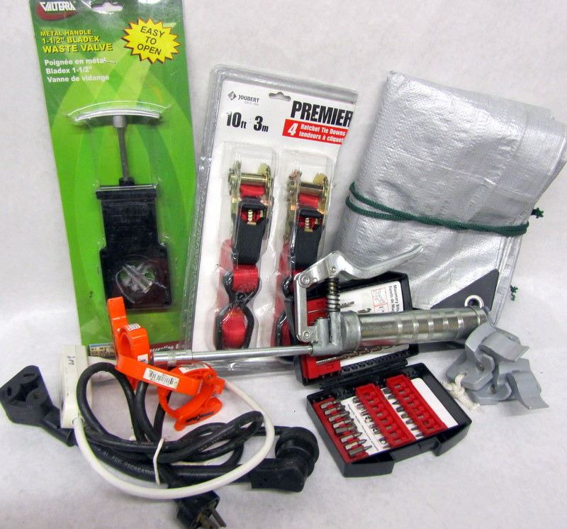 CB RADIO ANTENNA. SHOP LIGHTS. GREASE GUN. PROPANE BURNER. NAPTHA COOKSTOVE. TARP. RATCHET STRAPS. RV WASTE VALVE.