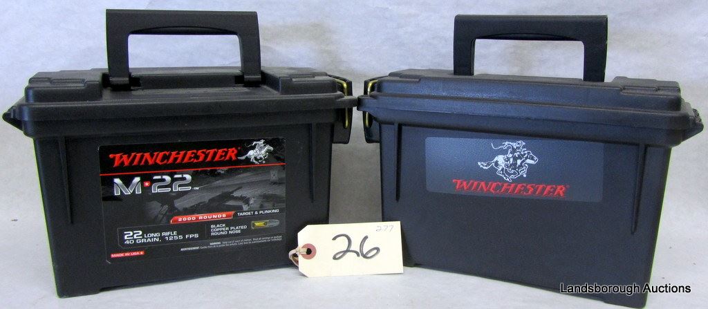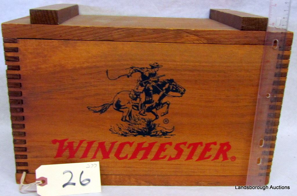 WOODEN DISPLAY CRATE WITH WINCHESTER LOGO. 2 PLASTIC AMMO DRY BOXES