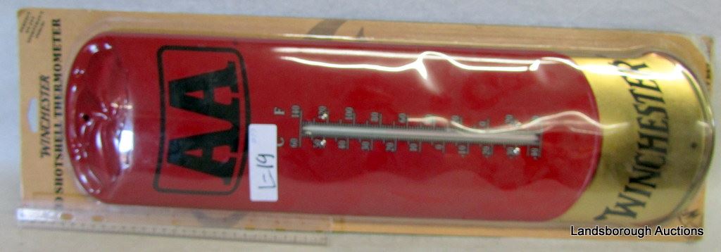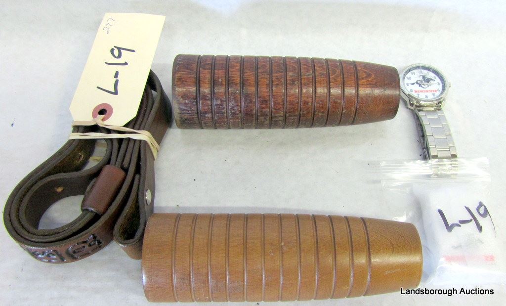 2 WINCHESTER DEFENDER WOOD FORENDS, WINCHESTER LEATHER SLING, WINCHESTER WATCH WITH CRACKED FACE, WINCHESTER LIGHTER, AND WINCHESTER 3D SHOTSHELL THERMOMETER
