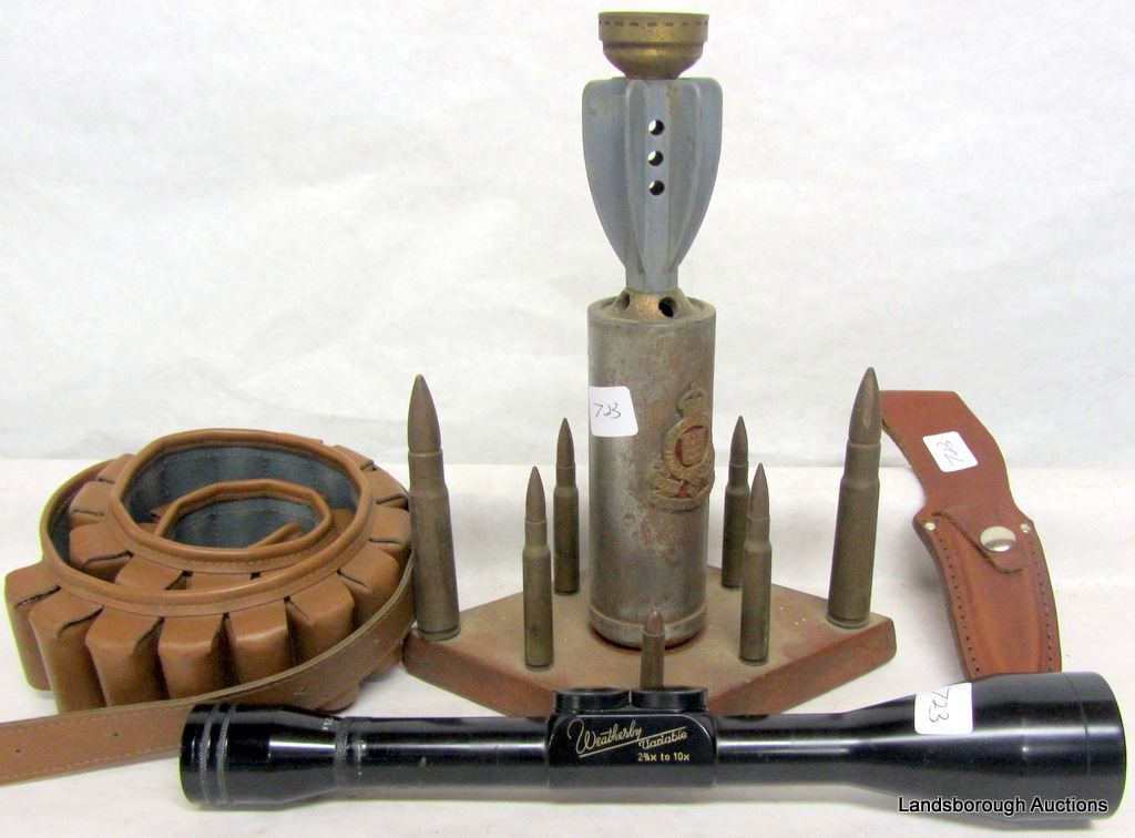 AMMO BELT, KNIFE SHEATH, STRAIGHT RASORS, WEATHERBY VARIABLE 2 34/ - 10 X 40 SCOPE, RIFLE AND SHOTGUN CLEANING KITS, BULLET DISPLAY, PACHMYR SNL GRIP, RP WHITE PEARL NAVY REMINGOTN GRIPS, BELT BUCKLE, PYTHON WATCH, SHOOTING PINS.