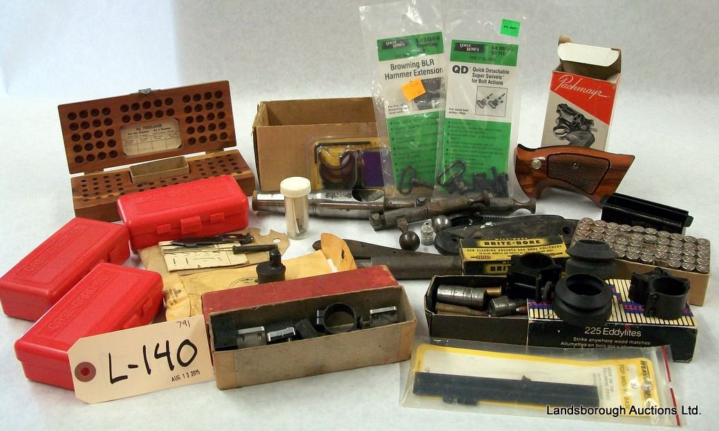 3 MTM BOXES, ONE 22 SHELL CASE, SCOPE MOUNTING PARTS, 25-20 HOMEMADE DIES AND 25 RELOADS, SET OF S&W WOODEN GRIPS, 2 COOEY BOLTS.