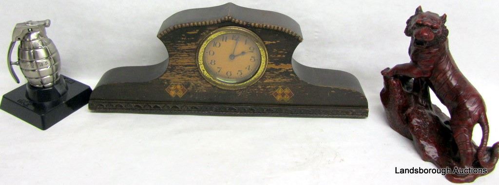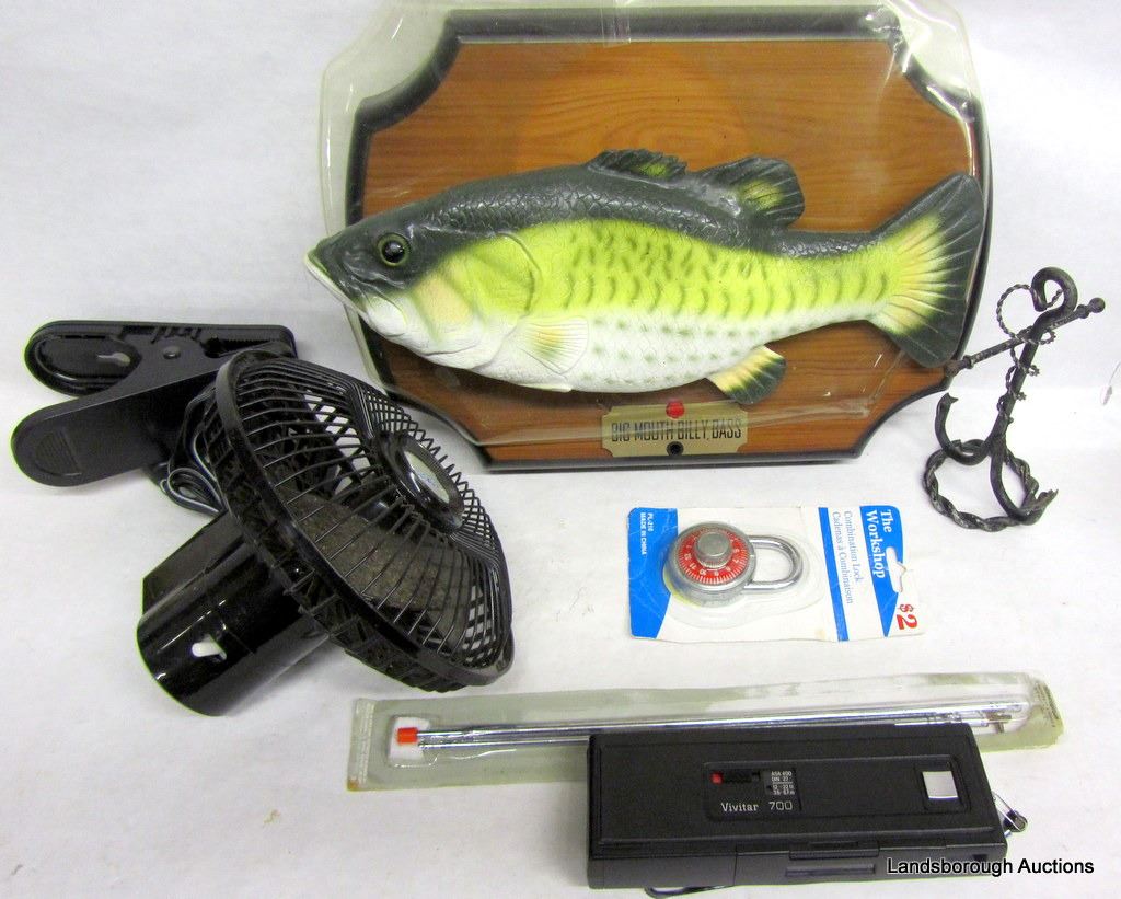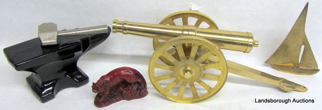 BRASS CANNON, BRASS SAILBOAT, LARGE RED TIGER, SMALL RED TIGER, MINIATUE ANVIL, MINIATURE ANCHOR, MINAITURE WATERING JUG, MK 2 LIGHTER GERNADE, MANTEL CLOCK, PLASTIC BIG MOUTH BILLY BASS, VIVITAR 700 POCKET CAMERA KIT, MINIATURE SCREWDRIVER KIT, MINIATURE FAN.
