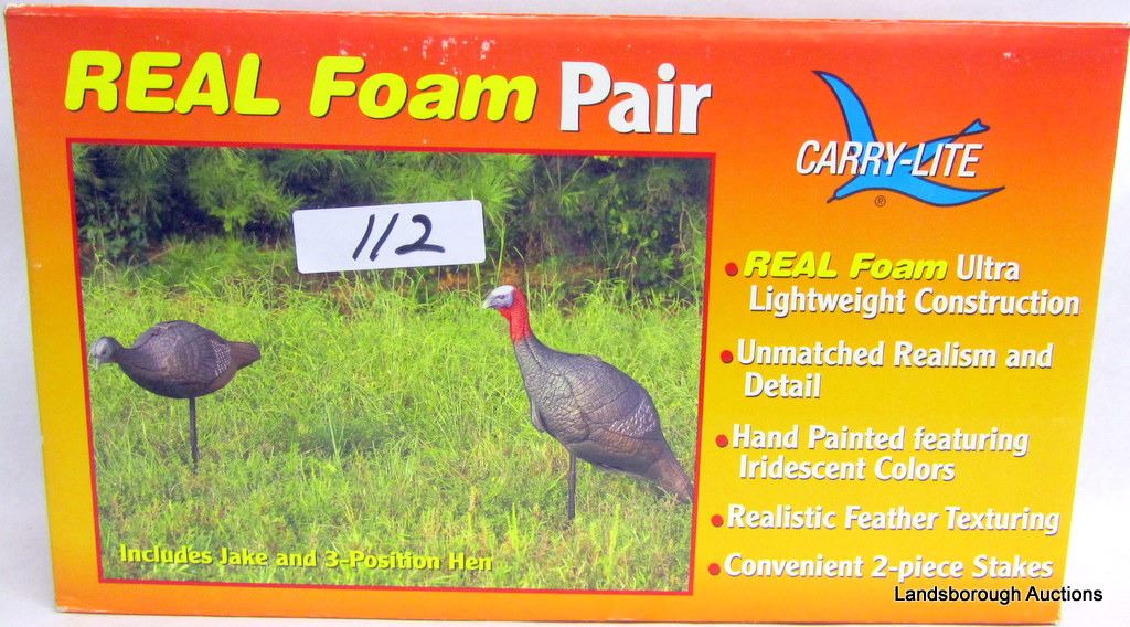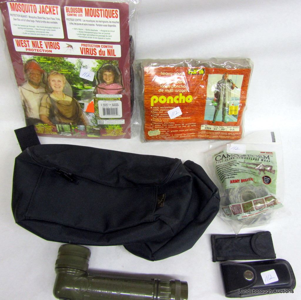 FOAM TURKEY DECOYS, FANNY PACK, FLASH LIGHT, MOSQUITO JACKET, PONCHO, LEATHER KNIFE SHEATH, CAMO FOAM TAPE, COWBOY ACTION SKARF AND TEE SHIRT.