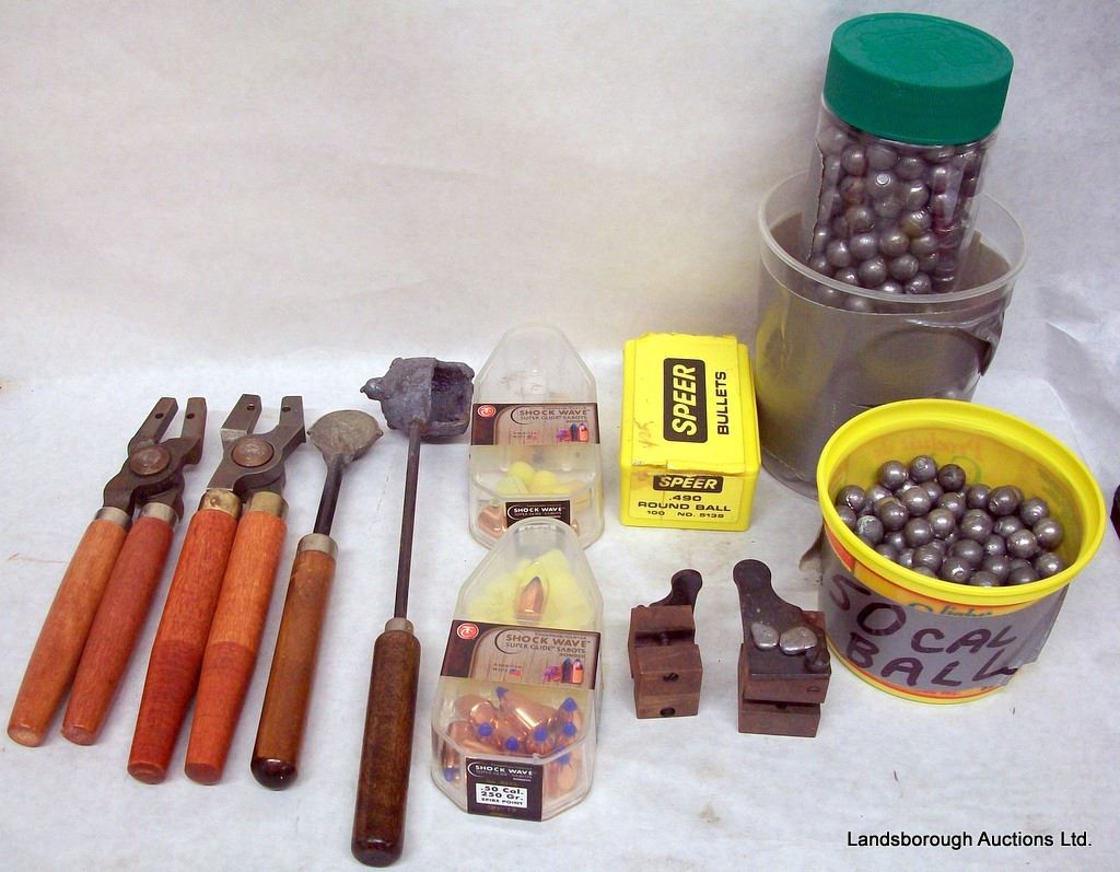 LEAD LADDLES, MOULD HANDLES, TC 50 CAL SABOTS, SPEER .490 BALL, HAND MADE 50 CAL BALL, LYMAN 495 MOULD, LYMAN 311 MOULD.