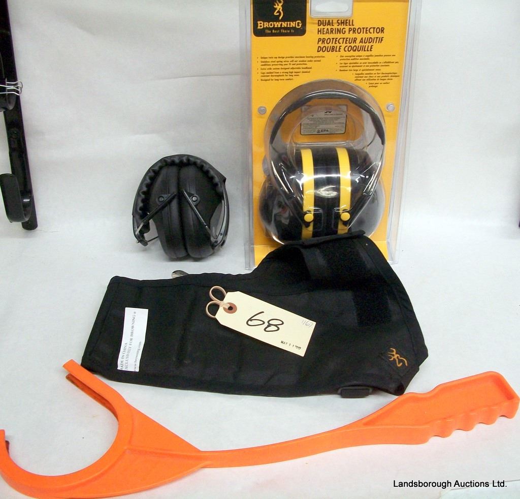 MAC GUN MASTER CLEANING KIT, CLAY THROWER, TWO HEARING PROTECTION, BROWNING REACTOR SHOOTING HARNESS.