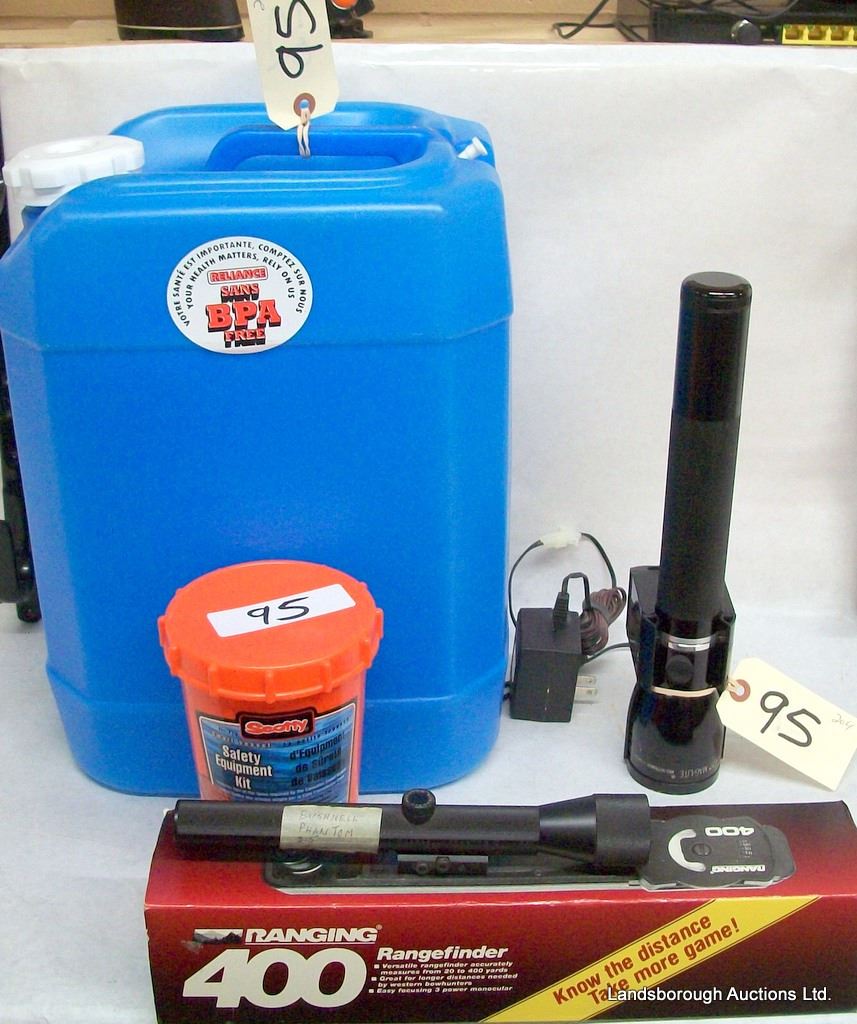 19 LITER BPA FREE WATER JUG, RECHARGABLE MAG LIGHT, SMALL VESSEL SAFETY EQUIPMENT KIT, RANGEFINDER 400, BUSHNELL PHANTOM II SCOPE.