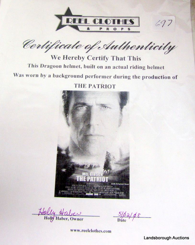 THE MOVIE THE PATRIOT. BUILT ON A RIDING HELMET. ESTIMATED SIZE 7 3/8. COMES WITH LETTER OF AUTHENTICITY.