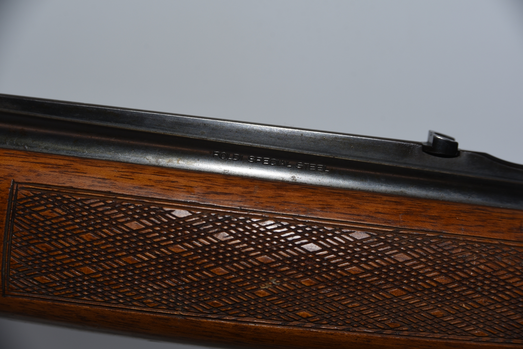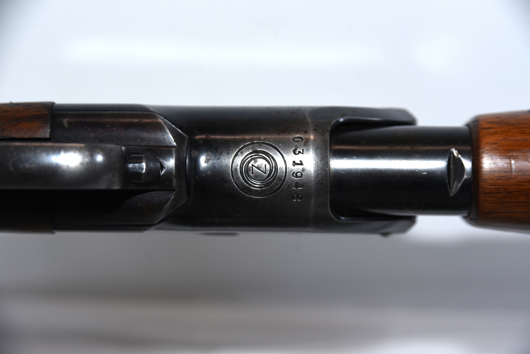 Wood stock shows scratches, scuffs, light dents, few cracks; condition is good.