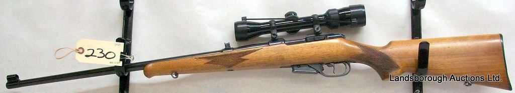 NON-RESTRICTED, BOLT ACTION, 22 HORNET, 23" BARREL, SN 05440. WOOD HAS A DENT, BLUING AND BORE VERY GOOD. DOUBLE SET TRIGGERS, BUSHNELL 1.75 - 5 X 32 SCOPE.