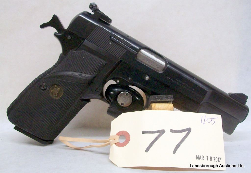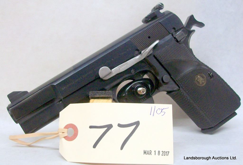 RESTRICTED, SEMI AUTO, 9MM LUGER, 118MM BARREL, SN 245PX75320. PACHMYR GRIPS VERY GOOD, BLUING HAS SOME SCRATCHES, BORE EXCELLENT.