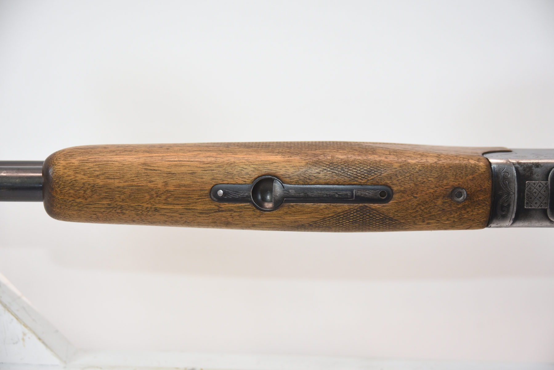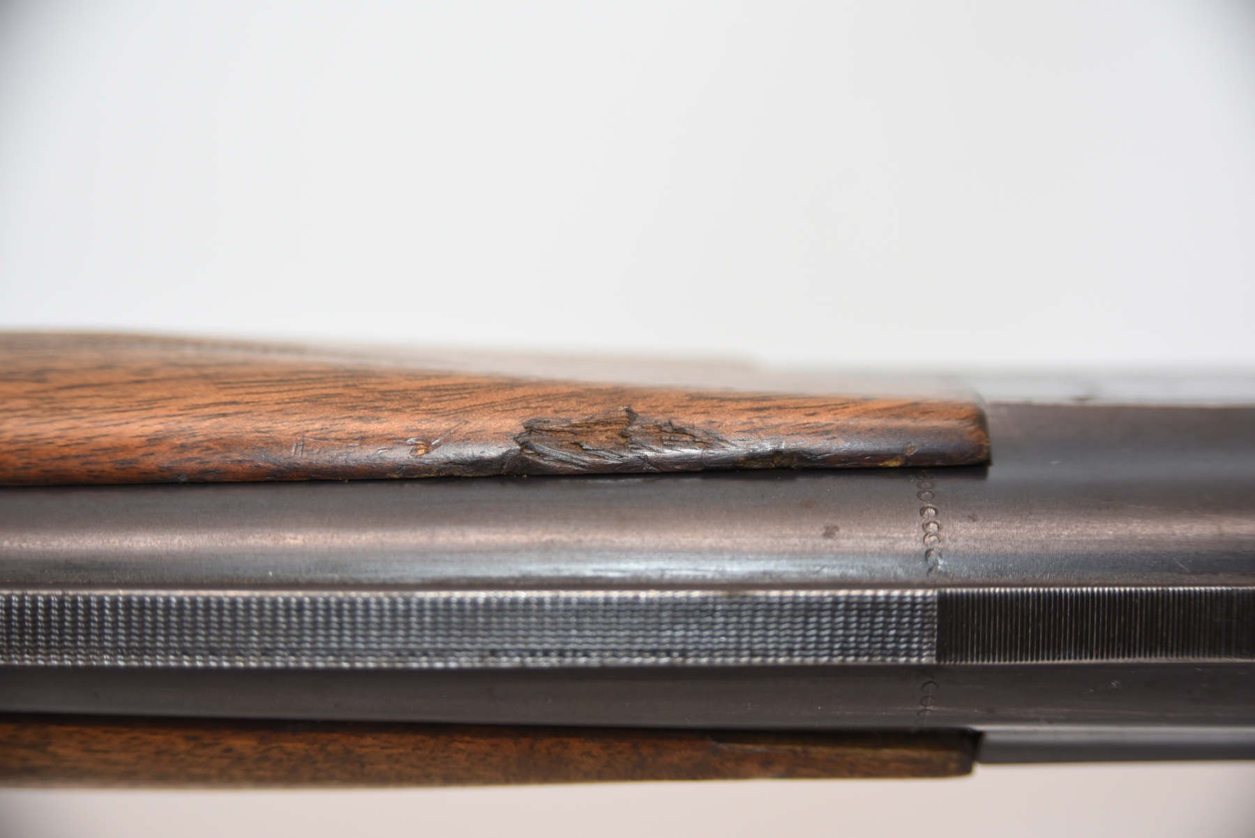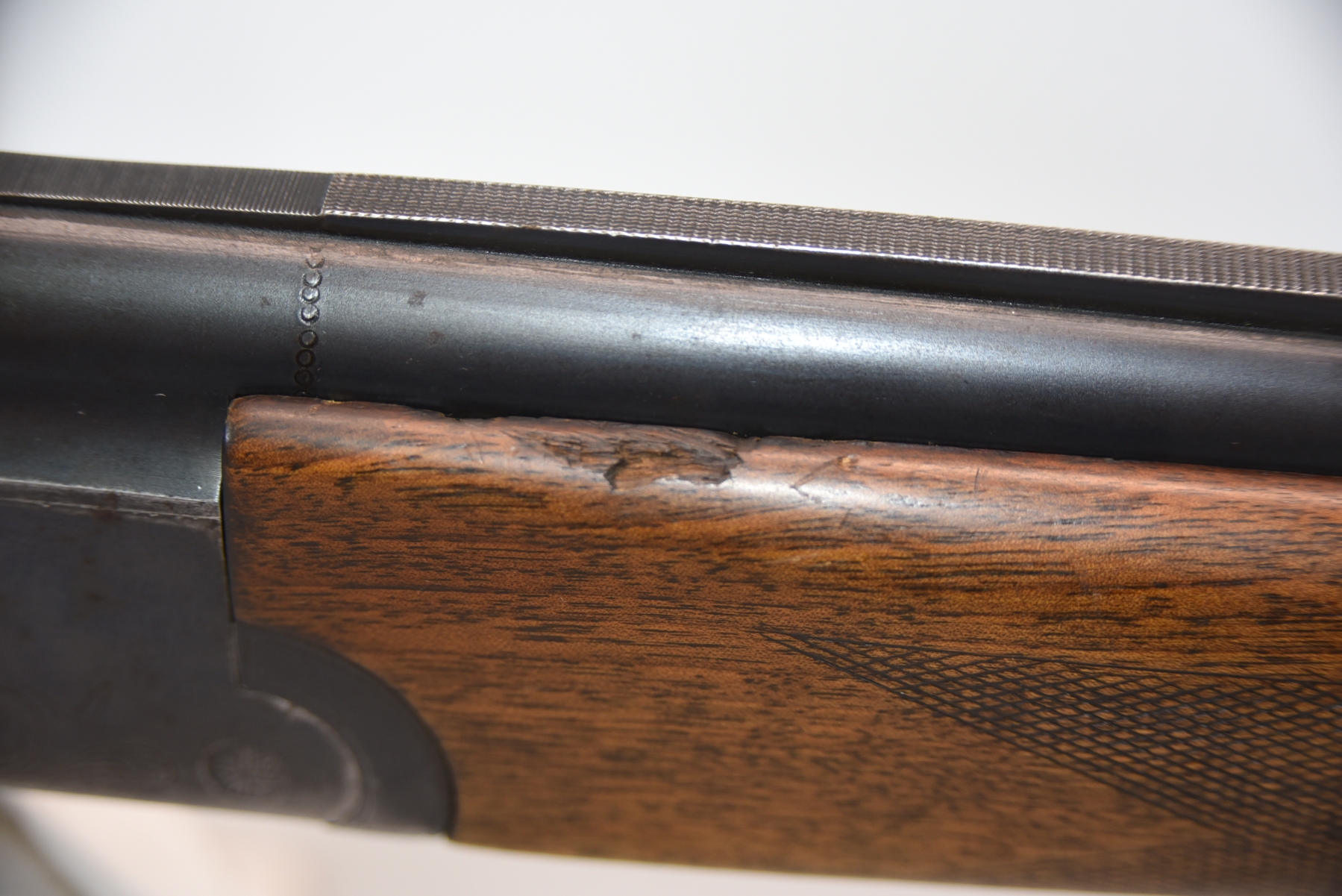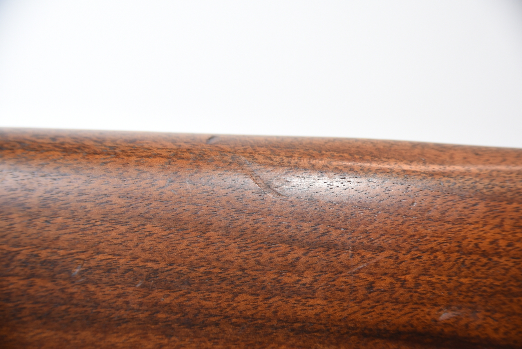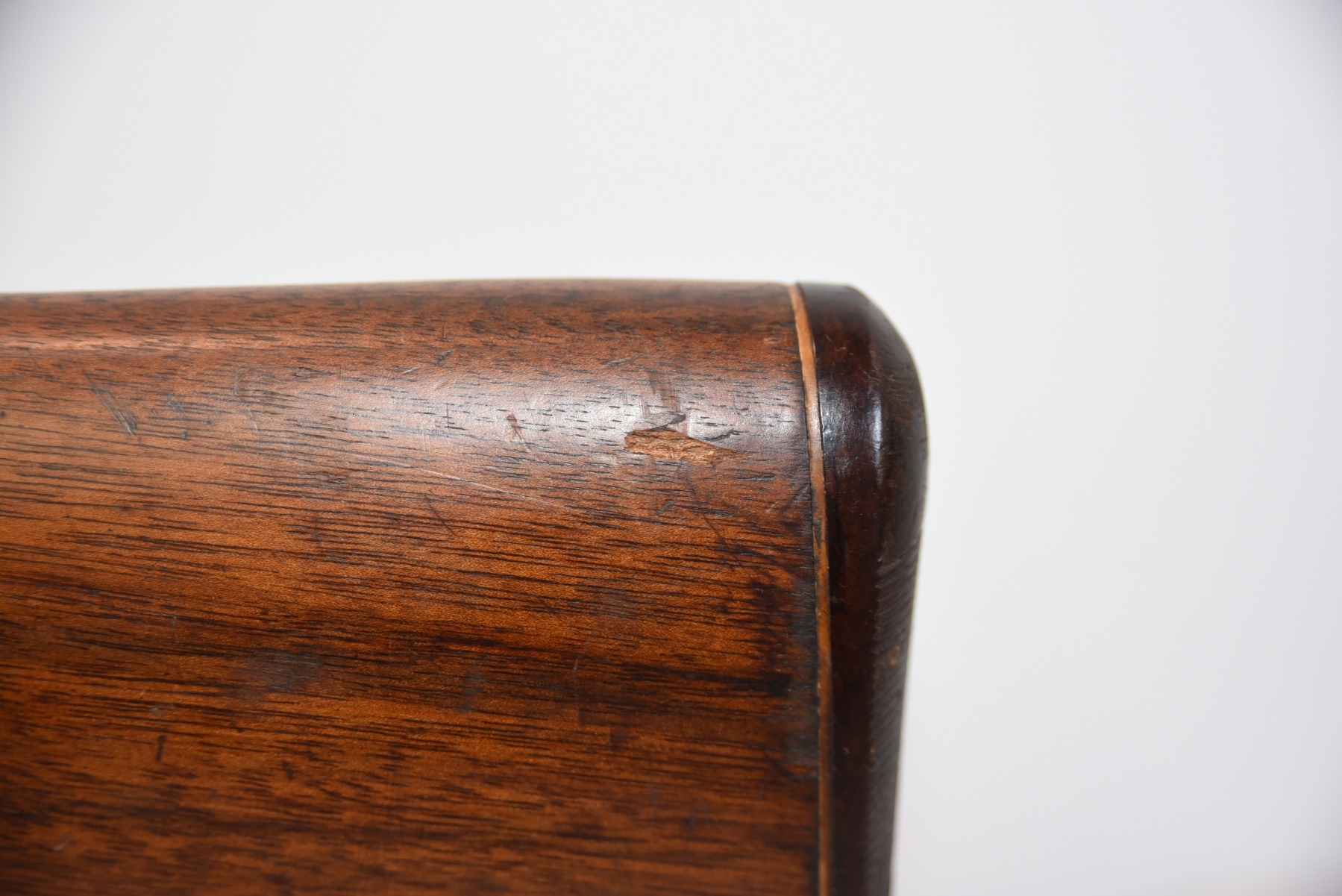 Wood stock shows chipping in the forearm, there are scratches and scuffs, finish wear, dents; condition is fair.
