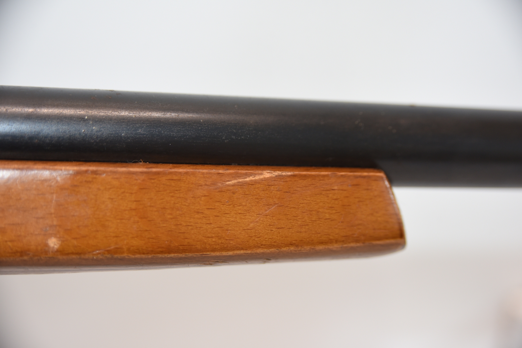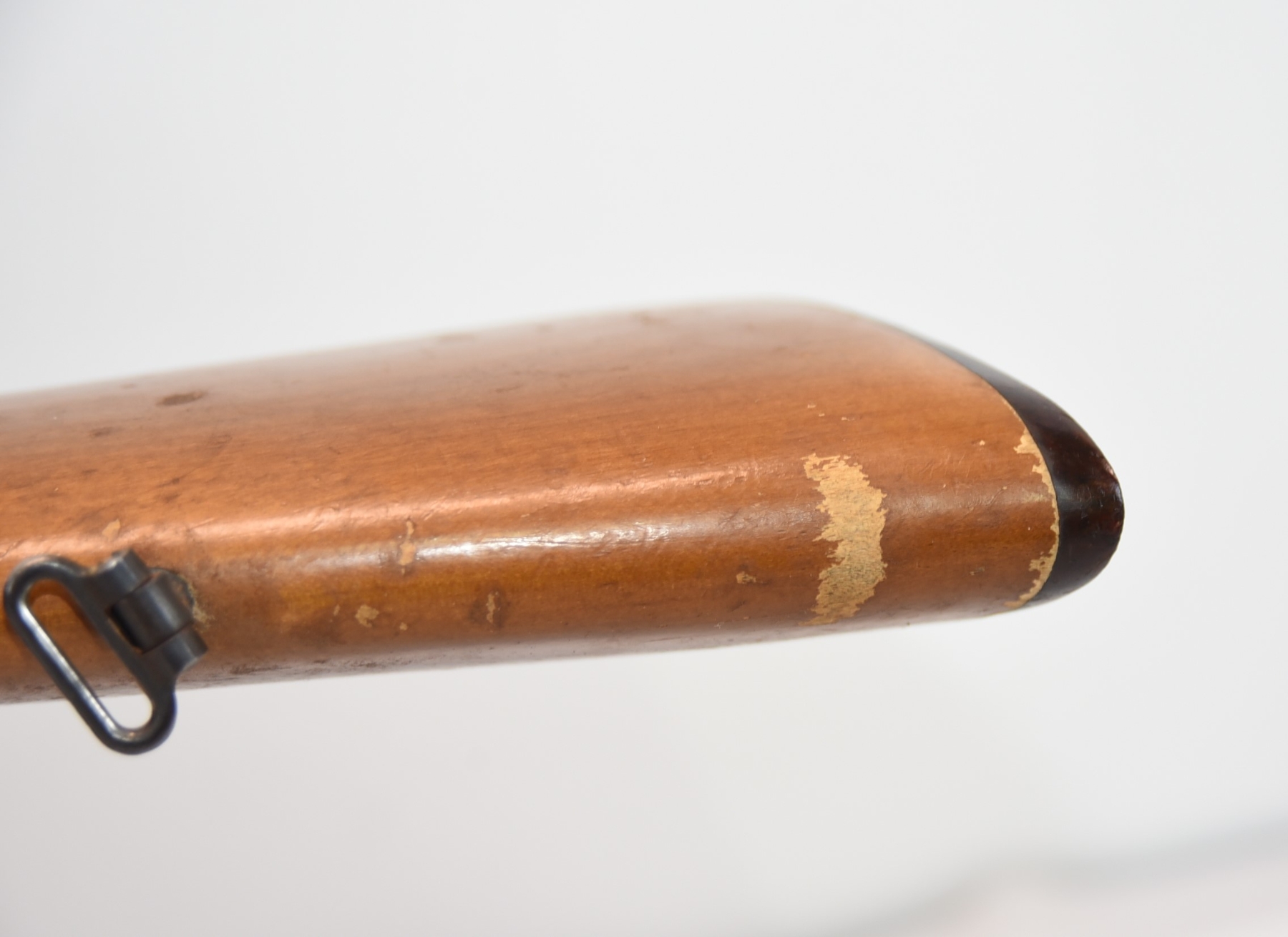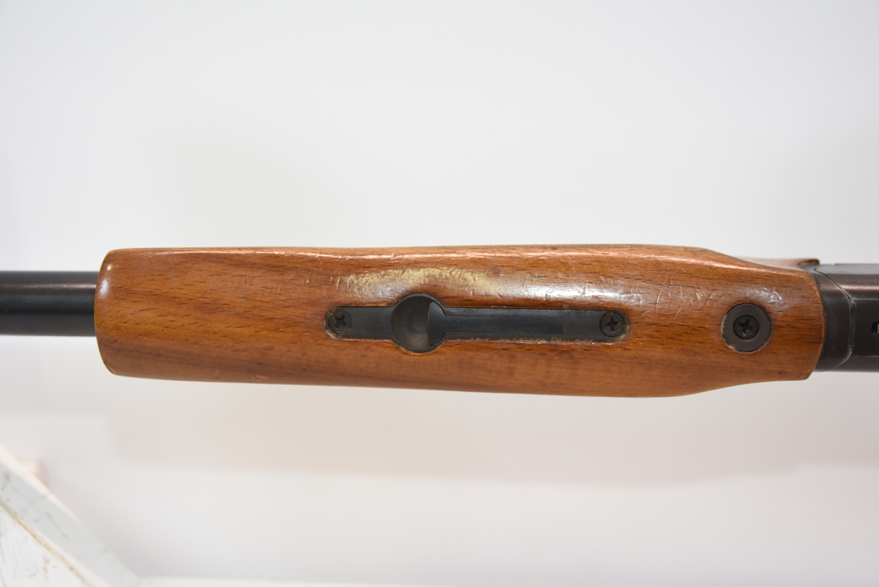 Wood stock shows scratches, scuffs, finish wear, cracks in the lower tang and one in the upper tang, there are dents present. Forearm fits loose on the firearm. Condition is fair.