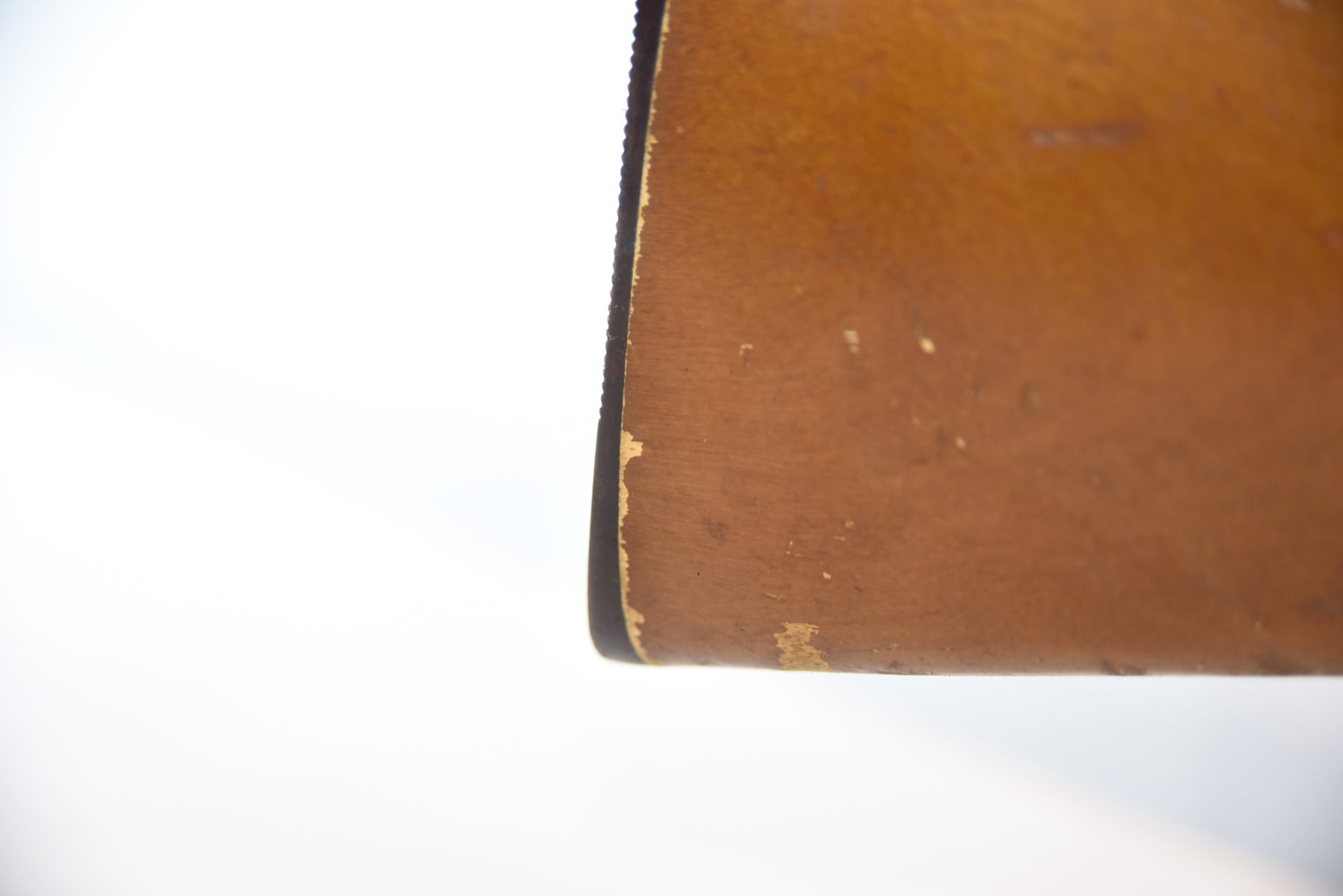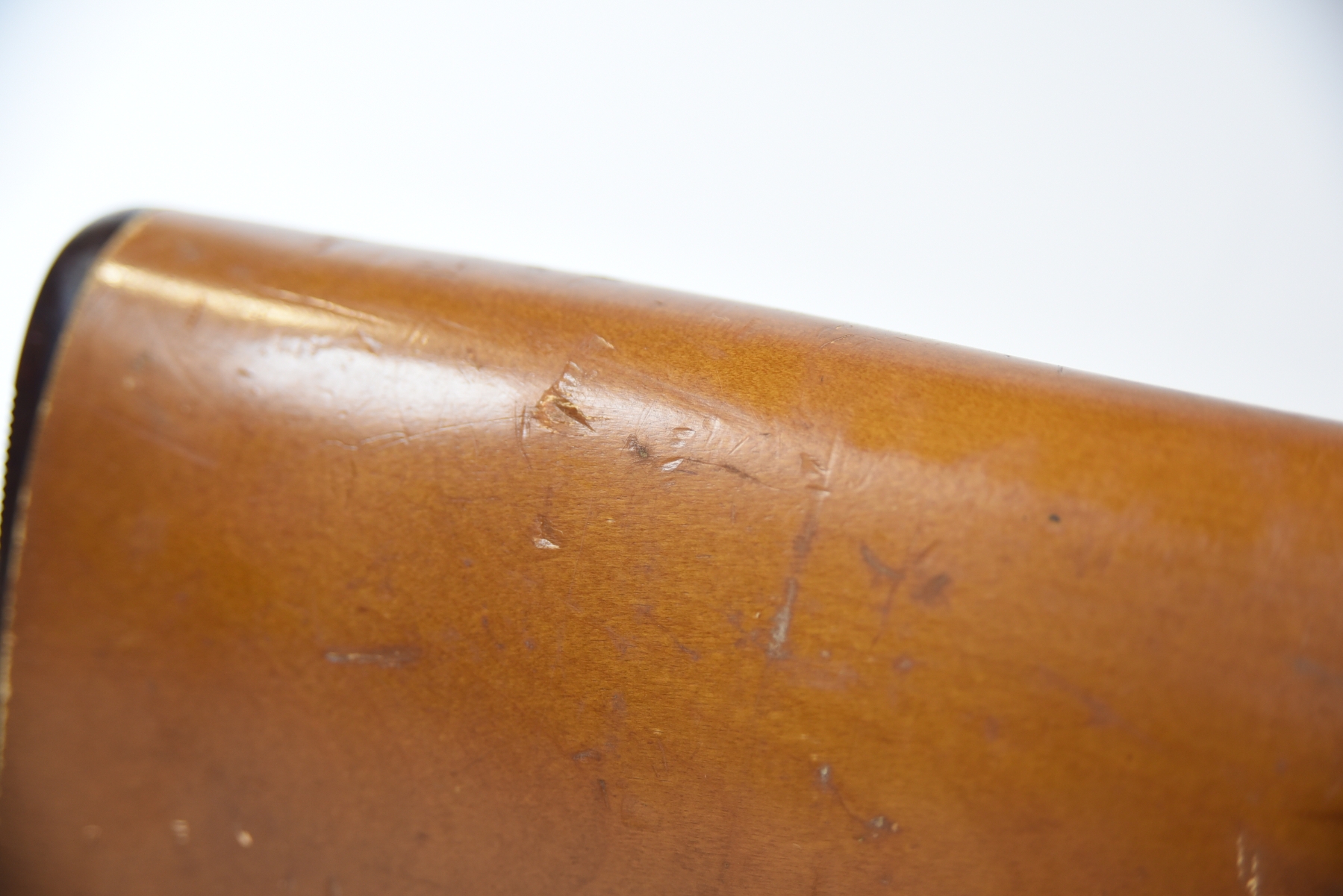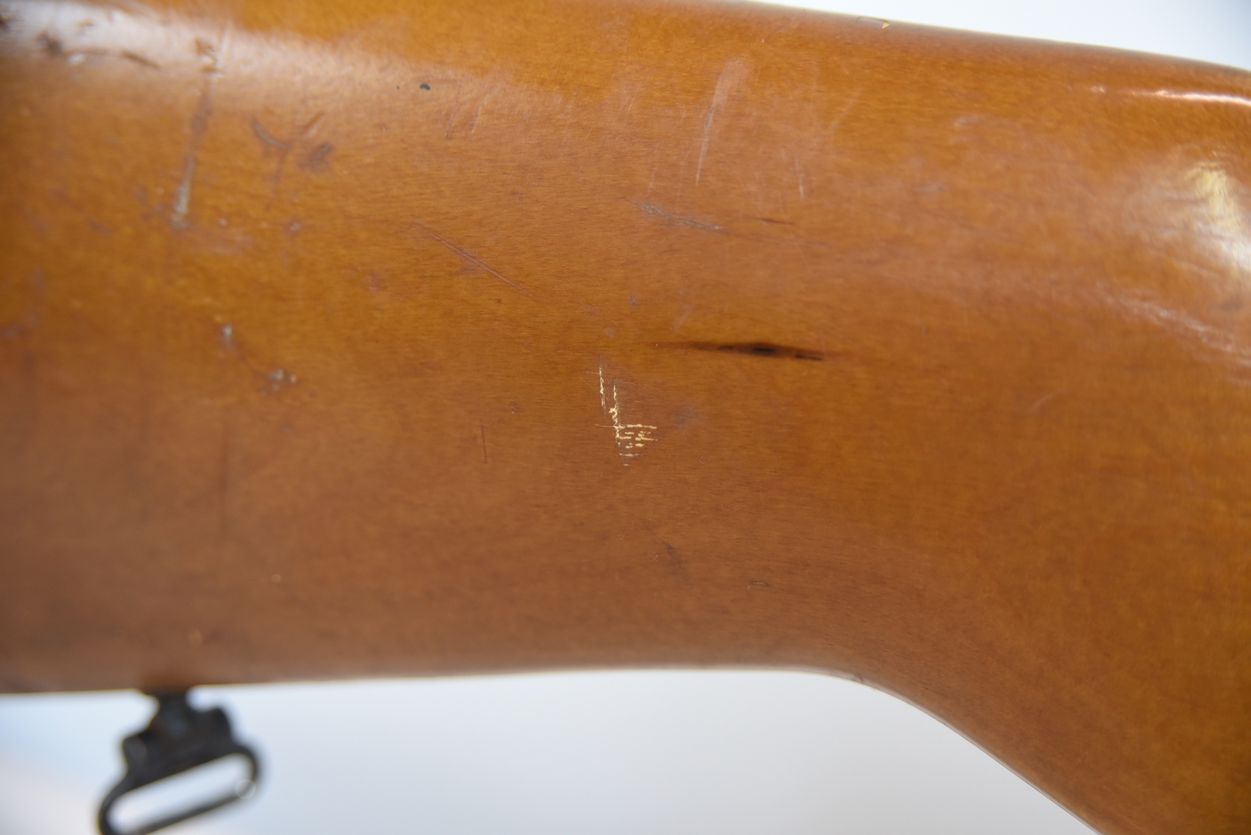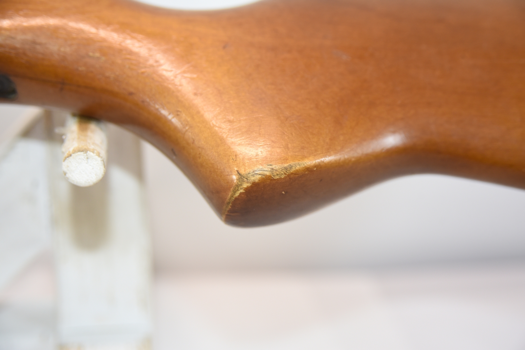Wood stock shows scratches, scuffs, finish wear, cracks in the lower tang and one in the upper tang, there are dents present. Forearm fits loose on the firearm. Condition is fair.
