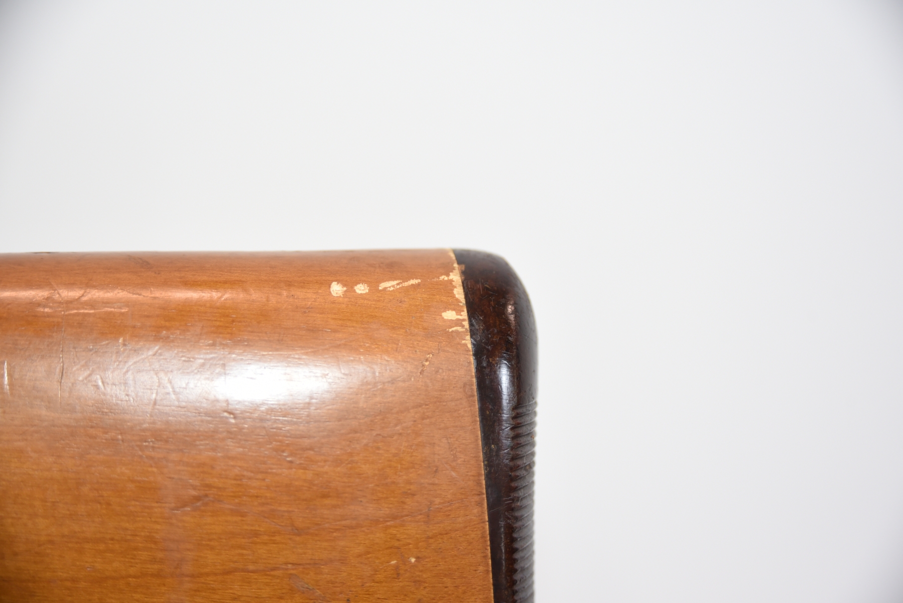 Metal shows some patina in areas, rust spots, finish wear, scratches and scuffs, few light dents; condition is fair.