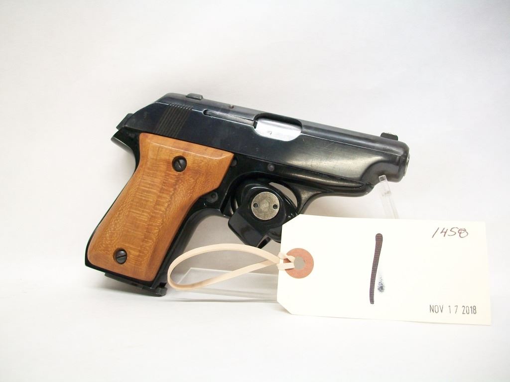 Prohibited, semi auto, 380 auto, 79mm barrel, SN 87522. A couple marks on the bluing otherwise very good condition. Extra mag.